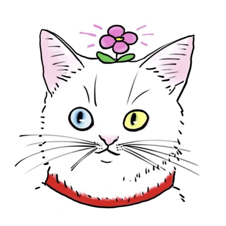 上掲のロゴマーク中においては,「植保ネコ」は黒目のネコとして描かれていますが,Instagramのアイコン,部室の扉に貼り付けられた絵,学祭の際に掲示される看板に代表されるように,右目は水色,左目が黄色というオッドアイを具えた猫として描かれることもあります(右の画像).